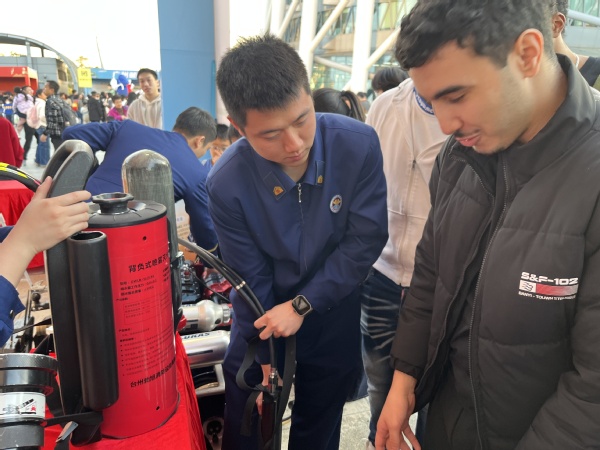 师生们还参观了广州消防119指挥中心的展台,了解消防安全知识,并在消防员的指导下尝试了背负式喷雾灭火器,试穿了灭火救援服。